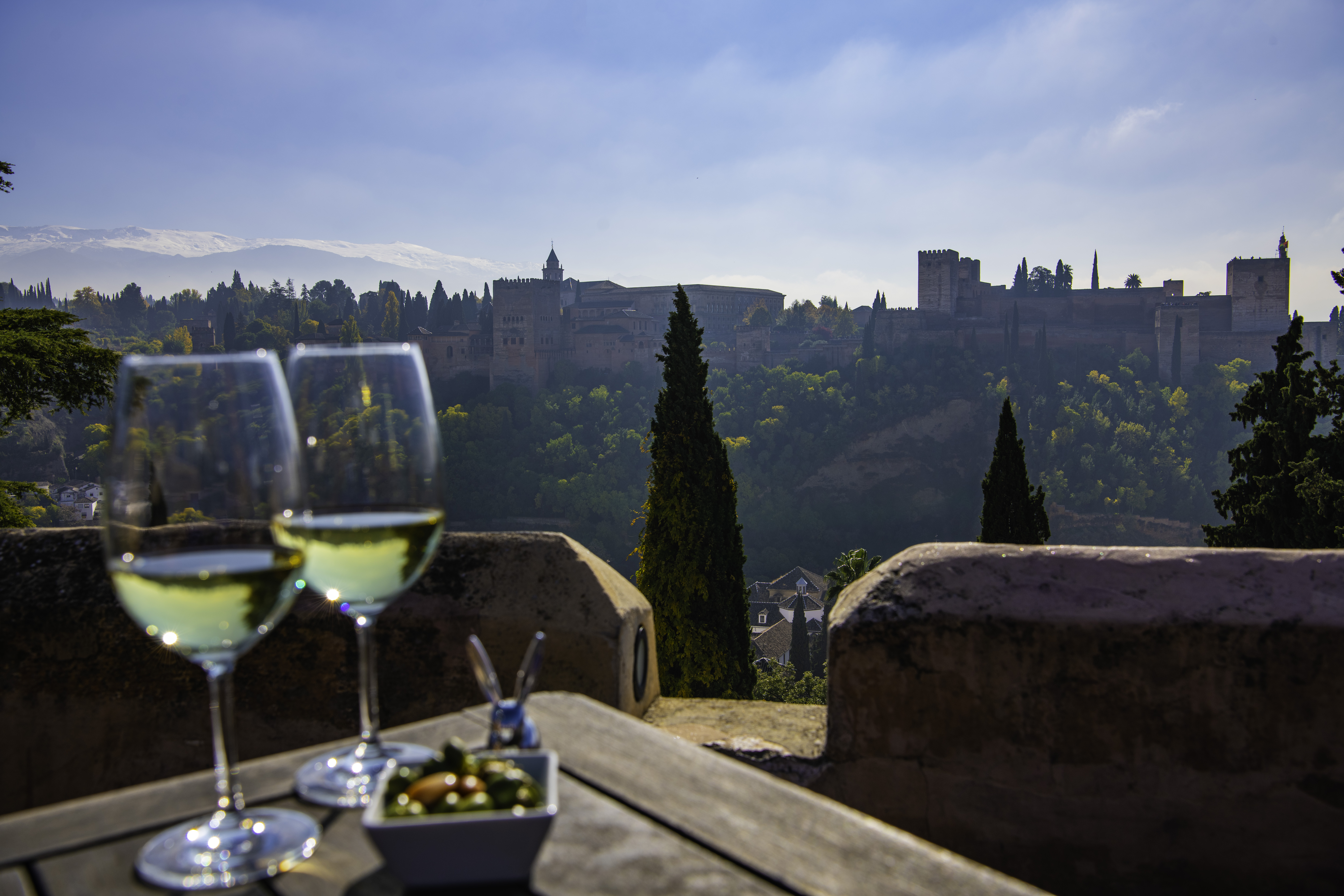 Starting at the top of the stairs, which leads down into the restaurant, there’s a fantastic view of the Alhambra with the Sierra Nevada peaks to the left and sweeping views of the city of Granada to the right.