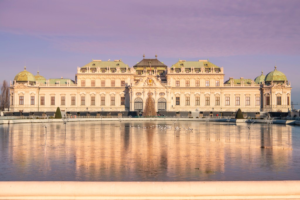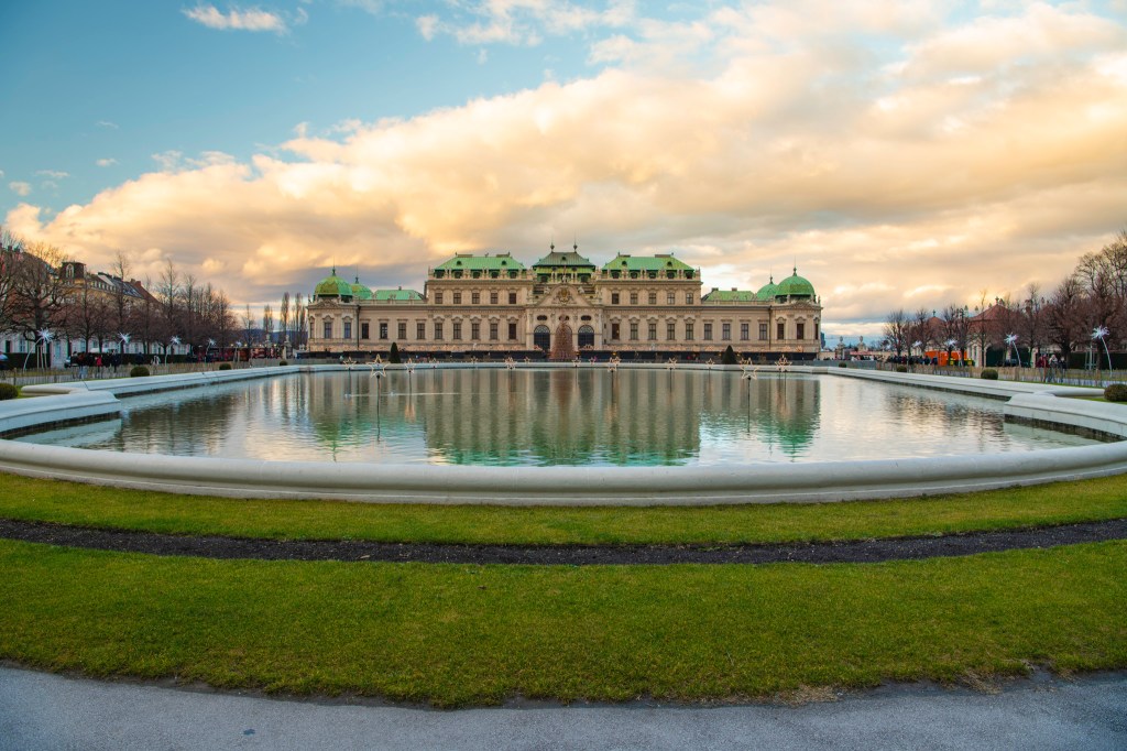 The magnificence of the Upper Belvedere is doubled as it is reflected in the pond at the entrance to the palace grounds.