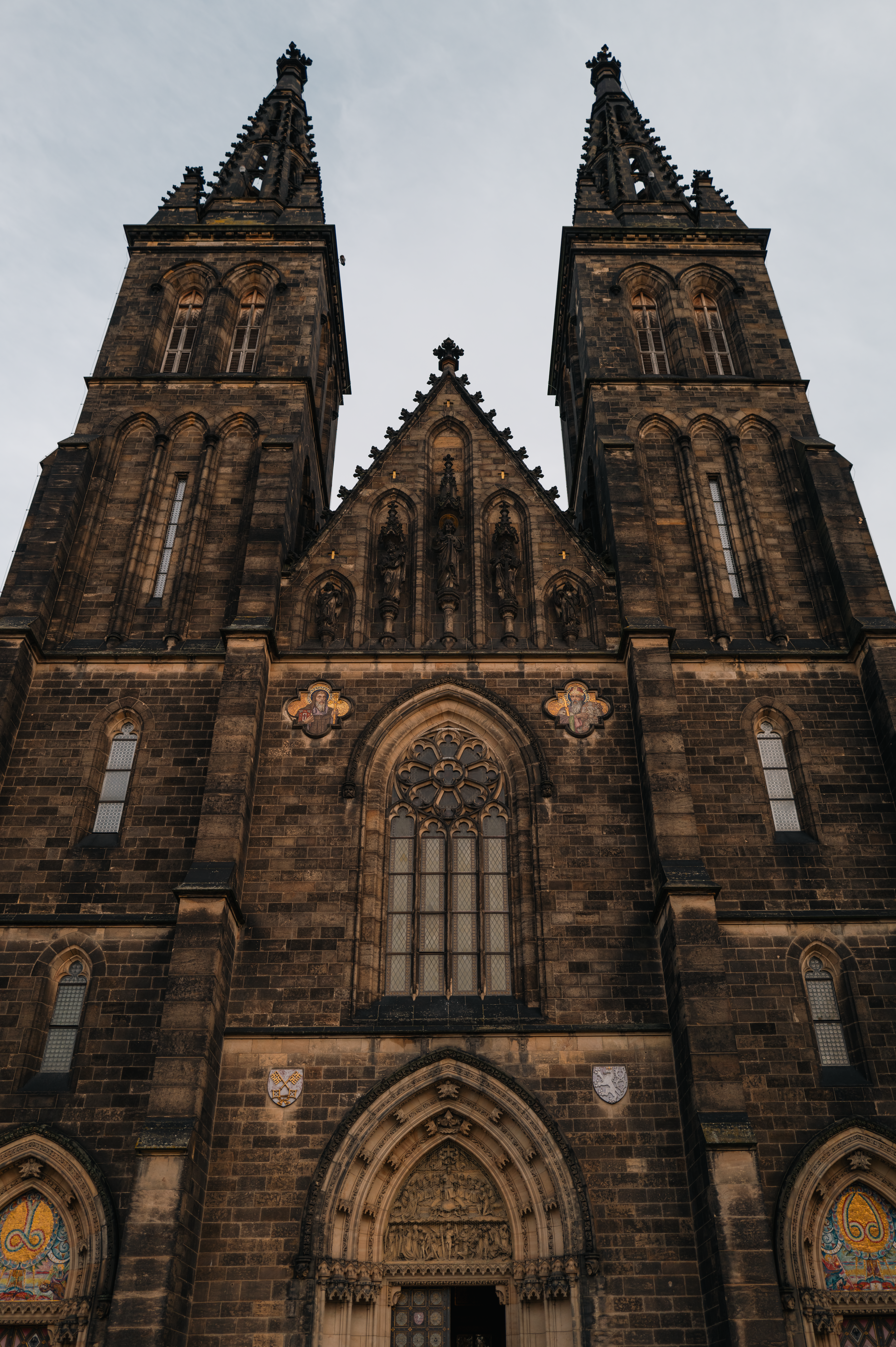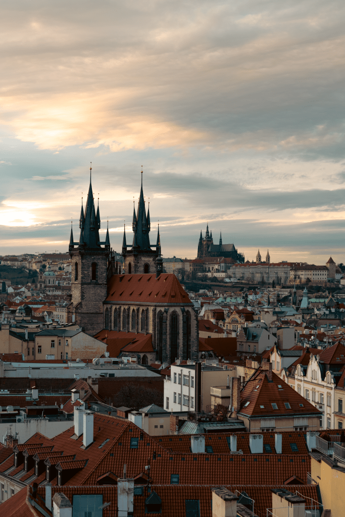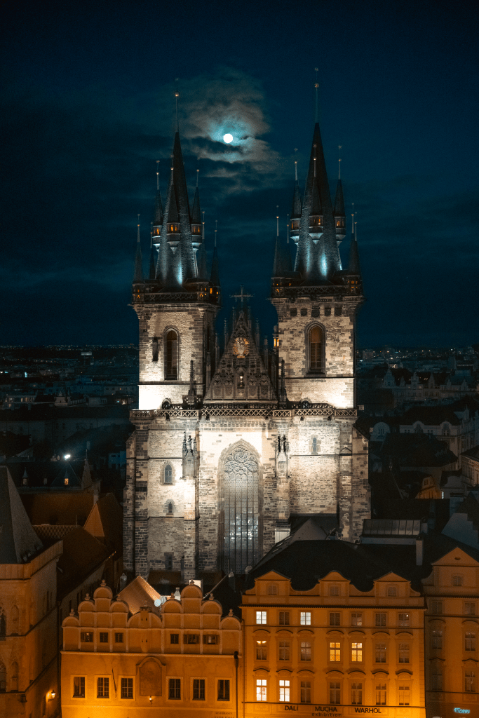 The majestic twin spires, stretching towards the heavens, create an iconic silhouette visible from diverse viewpoints within the city. This historical marvel has commanded attention in the heart of Prague for centuries, its allure heightened as dusk falls, casting an enchanting spell over the surroundings.